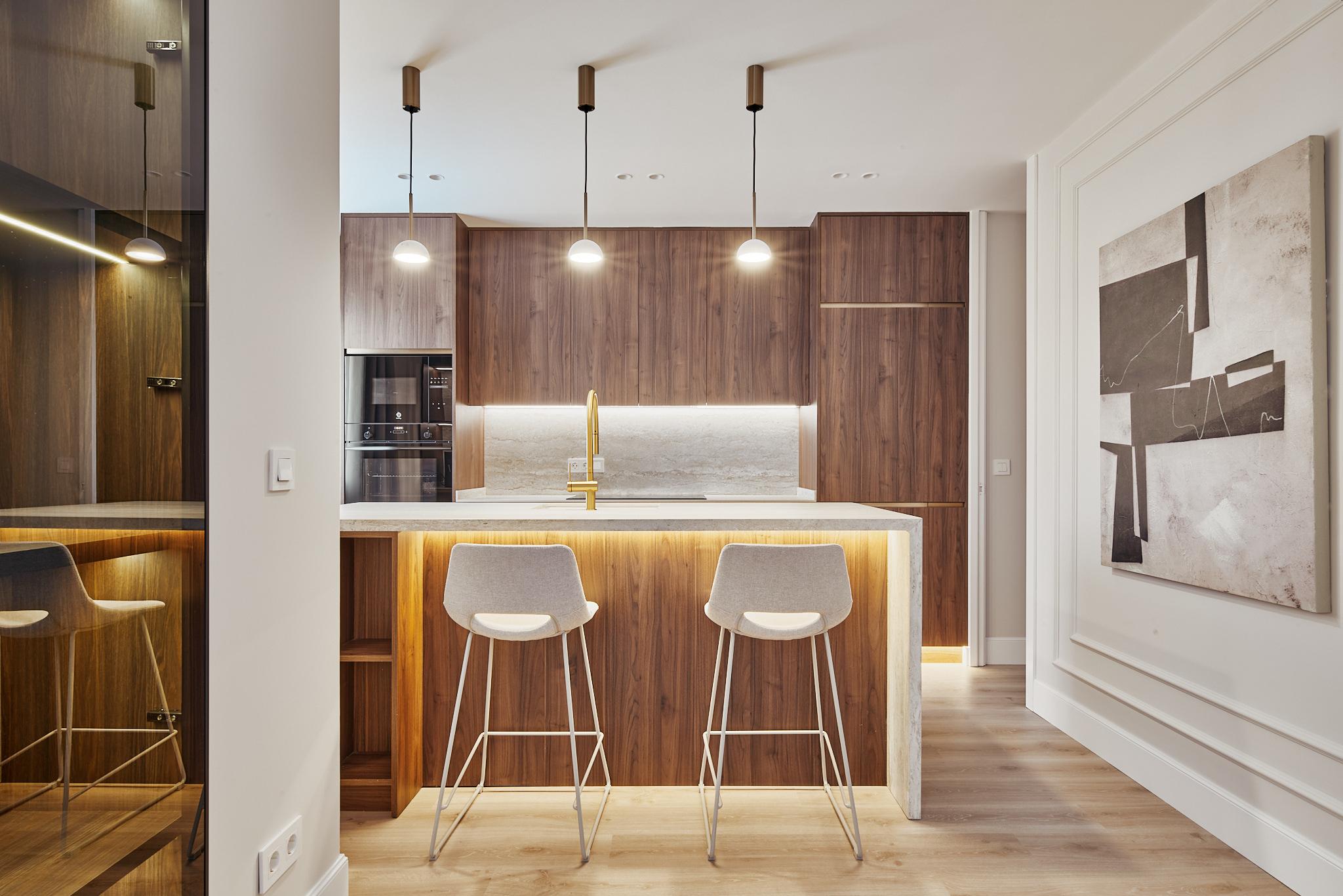 La cocina, moderna y totalmente equipada, se integra con naturalidad en el espacio y combina estética y practicidad. El amplio salón, inundado de luz natural, está diseñado como punto de encuentro para el descanso y la vida social. Su distribución fluida aprovecha cada metro cuadrado, creando un ambiente equilibrado y acogedor.